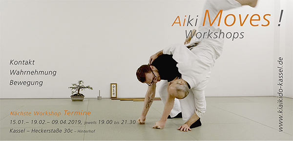 ------------------------- Aiki Moves ! - Termine für Anfang Januar In 2019 wollen wir verstärkt Aiki-Moves anbieten - zunächst mit einigen Wochen Abstand und wenn die Abende gut ankommen und angenommen werden, künftig auch häufiger. Die ersten Termine in neuen Jahr sind:15.Januar 2019 ; 19. Februar 2019 ; 9. April 2019; jeweils 19:00 bis 21:30. Wir freuen uns auf euch.